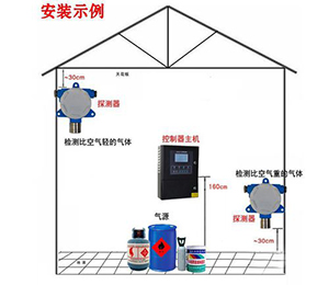 10、對(duì)于檢測(cè)可燃?xì)怏w比重大于空氣的諸如烷烴類(甲烷沼氣、民用煤氣除外)、烯烴類(乙烯除外),液化石油氣、汽油、煤油時(shí),請(qǐng)將探測(cè)器安裝在低于泄漏點(diǎn)的下方平面上,距地面不得高于30cm。并請(qǐng)注意周圍的環(huán)境特點(diǎn),例如室內(nèi)通風(fēng)不流暢部位,地槽地溝容易積聚可燃?xì)怏w的地方,現(xiàn)場(chǎng)通往控制室的地下電纜溝,有密封蓋板的污水溝槽等,都是經(jīng)常性的或在生產(chǎn)不正常情況下容易積聚可燃?xì)獾膱?chǎng)所,對(duì)于這些環(huán)境都是不可忽視的安全監(jiān)測(cè)點(diǎn)。